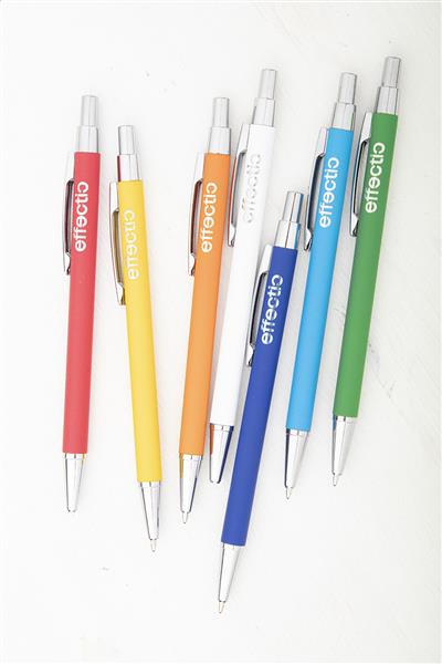 Aluminiowy długopis z gumowanym wykończeniem i niebieskim wkładem. Ze specjalną powłoką pod grawer lustrzany.