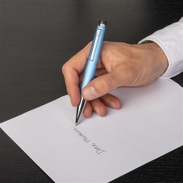 Pióro kulkowe Chronobike w kolorze jasnoniebieskim z delikatnymi, chromowanymi, metalicznymi akcentami łączy w sobie sportowy i luksusowy charakter.