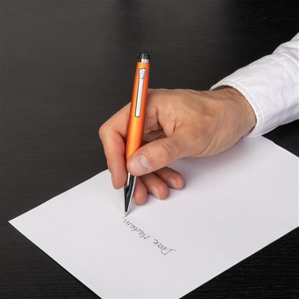 Pióro kulkowe Chronobike o matowej fakturze w kolorze pomarańczowym. Pióro z delikatnymi, chromowanymi, metalicznymi akcentami łączy w sobie sportowy i luksusowy charakter. Rozmiar: Dia. 13 / h. 139 mm Kolor: Pomarańczowy