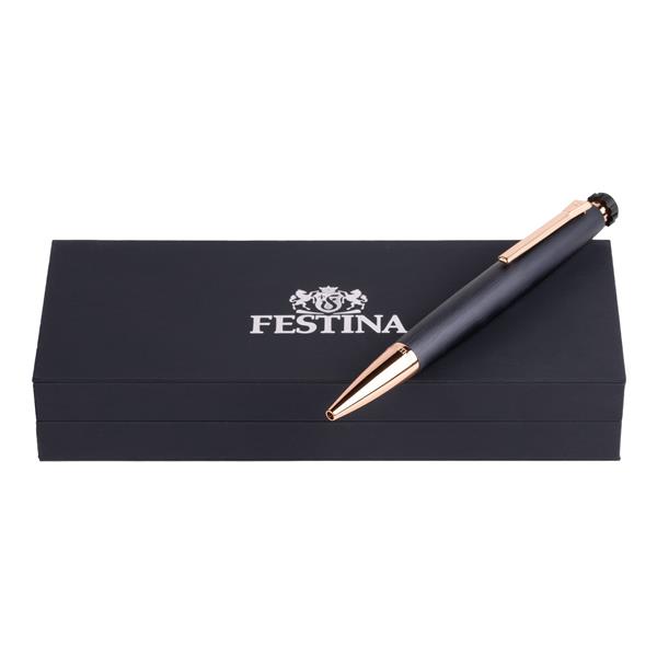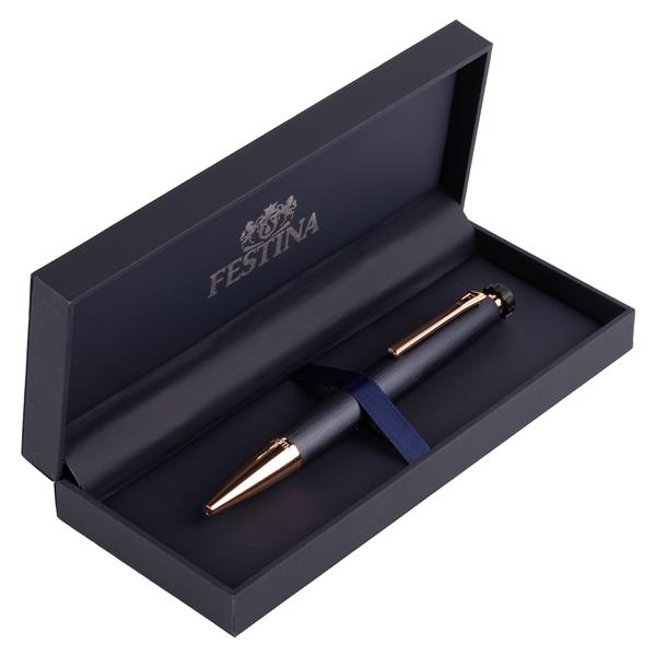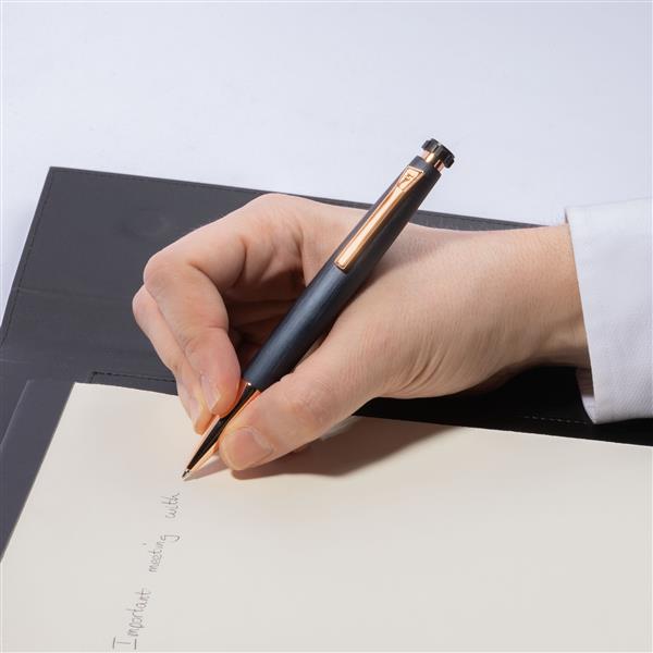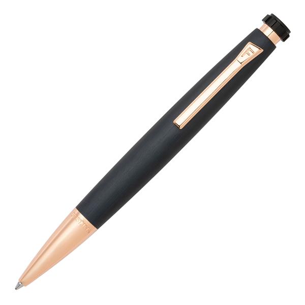 Połączenie chromowanego wykończenia, matowej faktury w kolorze granatu i złoto-różowych, metalicznych detali. Długopis Chronobike o ostrołukowym kształcie, nawiązującym do świata zegarmistrzowskiego, łączy sportowy wygląd z elegancją.