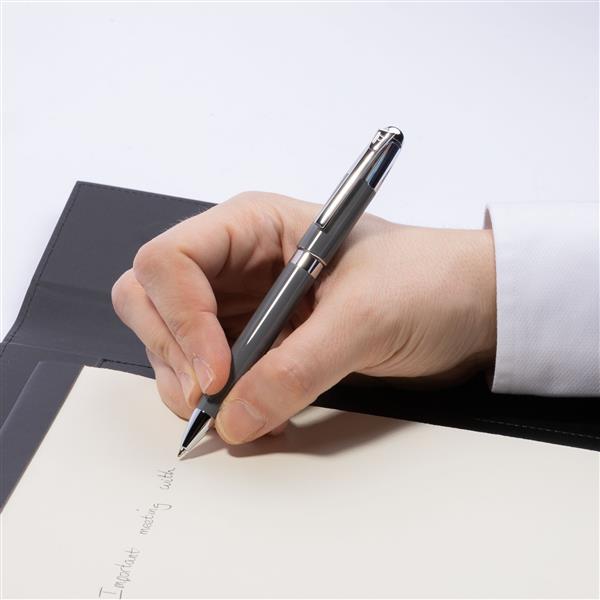 Elegancki, idealnie wyważony długopis w wielu wariantach kolorystycznych z subtelnymi chromowanymi akcentami. Długopis posiada wkład piszący na czarno. Rozmiar: Dia. 10 / h. 137 mm Kolor: Szary