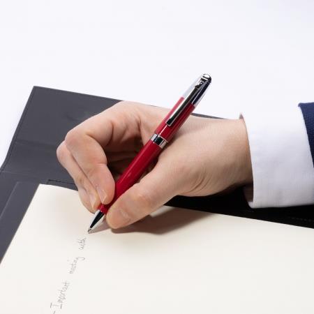 Elegancki, idealnie wyważony długopis w wielu wariantach kolorystycznych z subtelnymi chromowanymi akcentami. Długopis posiada wkład piszący na czarno. Rozmiar: Dia. 10 / h. 137 mm Kolor: Czerwony