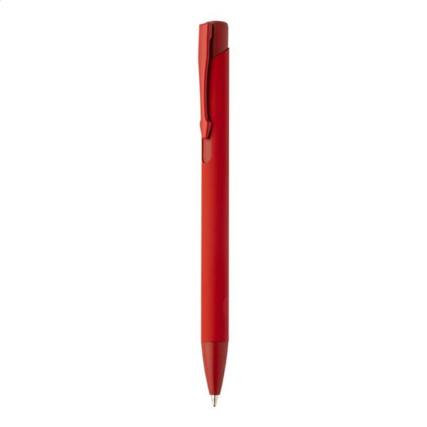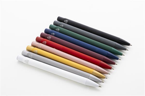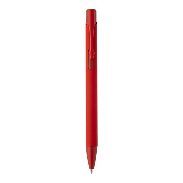 Długopis z recyklingowanego aluminium z gumowaną obudową i dopasowanymi kolorami. Z niebieskim wkładem.