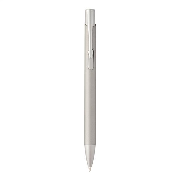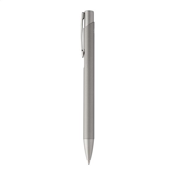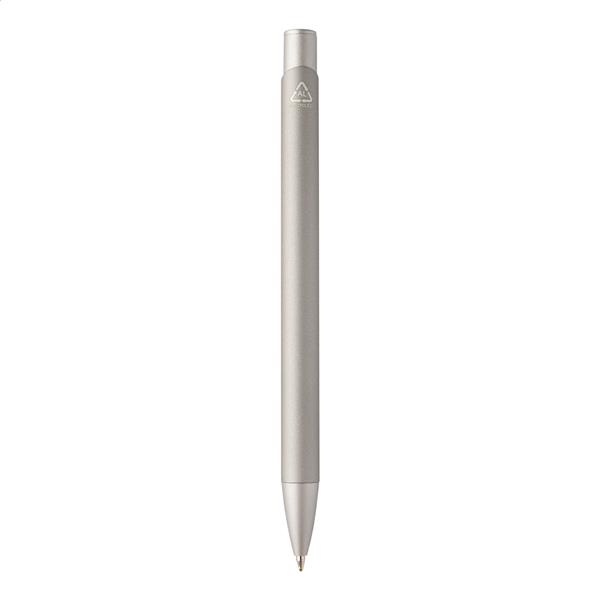 Długopis z recyklingowanego aluminium z gumowaną obudową i dopasowanymi kolorami. Z niebieskim wkładem.