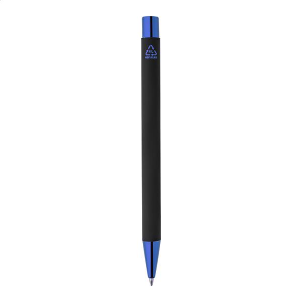 Długopis z recyklingowanego aluminium z czarną, gumowaną obudową i kolorowymi, błyszczącymi, metalowymi elementami. Ze specjalną powłoką do lustrzanego grawerowania, pasującą do metalowych elementów. Z niebieskim wkładem.