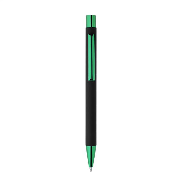 Długopis z recyklingowanego aluminium z czarną, gumowaną obudową i kolorowymi, błyszczącymi, metalowymi elementami. Ze specjalną powłoką do lustrzanego grawerowania, pasującą do metalowych elementów. Z niebieskim wkładem.