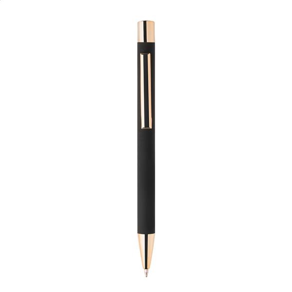 Długopis z recyklingowanego aluminium z czarną, gumowaną obudową i kolorowymi, błyszczącymi, metalowymi elementami. Ze specjalną powłoką do lustrzanego grawerowania, pasującą do metalowych elementów. Z niebieskim wkładem.