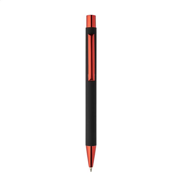 Długopis z recyklingowanego aluminium z czarną, gumowaną obudową i kolorowymi, błyszczącymi, metalowymi elementami. Ze specjalną powłoką do lustrzanego grawerowania, pasującą do metalowych elementów. Z niebieskim wkładem.