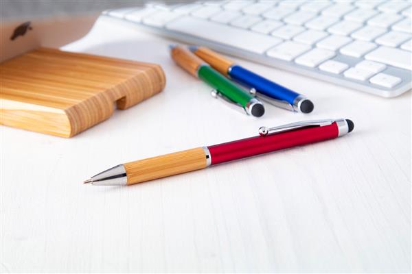 Plastikowy, przekręcany długopis z końcówką do ekranów dotykowych z bambusowym uchwytem, metalicznym wykończeniem obudowy i błyszczącymi chromowanymi elementami. Z niebieskim wkładem.
