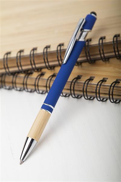 Aluminiowy długopis z końcówką do ekranów dotykowych, z bambusowym uchwytem i gumowanym wykończeniem. Ze specjalną powłoką pod grawer lustrzany. Z niebieskim wkładem.