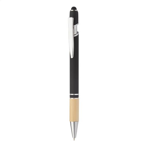 Aluminiowy długopis z końcówką do ekranów dotykowych, z bambusowym uchwytem i gumowanym wykończeniem. Ze specjalną powłoką pod grawer lustrzany. Z niebieskim wkładem.