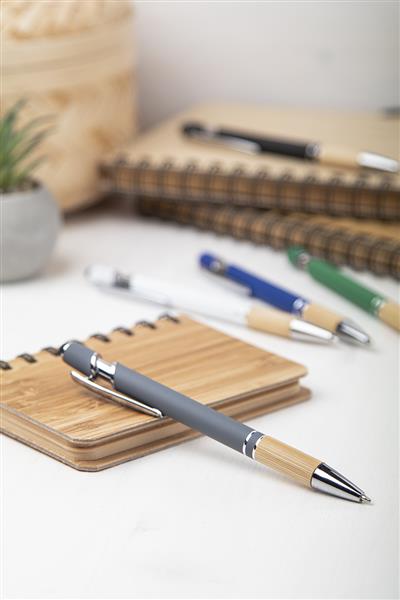 Aluminiowy długopis z końcówką do ekranów dotykowych, z bambusowym uchwytem i gumowanym wykończeniem. Ze specjalną powłoką pod grawer lustrzany. Z niebieskim wkładem.
