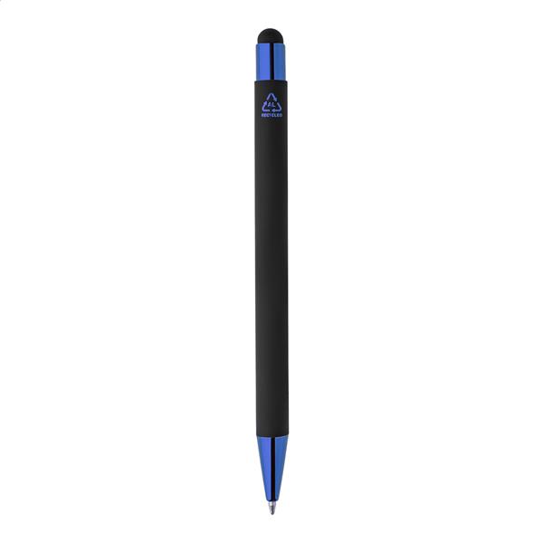 Długopis z recyklingowanego aluminium z końcówką do ekranów dotykowych, z czarną, gumowaną obudową i kolorowymi, błyszczącymi, metalowymi elementami. Ze specjalną powłoką do grawerowania lustrzanego, pasującą do metalowych elementów. Z niebieskim wkładem.