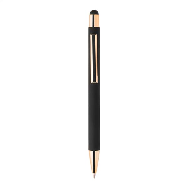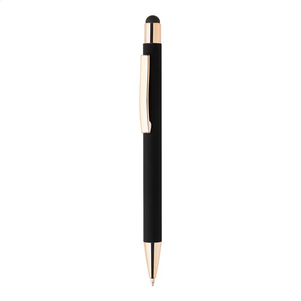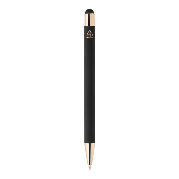 Długopis z recyklingowanego aluminium z końcówką do ekranów dotykowych, z czarną, gumowaną obudową i kolorowymi, błyszczącymi, metalowymi elementami. Ze specjalną powłoką do grawerowania lustrzanego, pasującą do metalowych elementów. Z niebieskim wkładem.