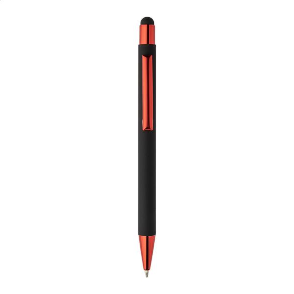Długopis z recyklingowanego aluminium z końcówką do ekranów dotykowych, z czarną, gumowaną obudową i kolorowymi, błyszczącymi, metalowymi elementami. Ze specjalną powłoką do grawerowania lustrzanego, pasującą do metalowych elementów. Z niebieskim wkładem.