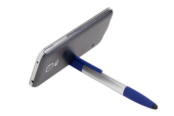 5w1 plastikowy długopis z końcówką do ekranów dotykowych, uchwytem na telefon, linijką, czyścikiem do ekranów i śrubokrętem. Z niebieskim wkładem.