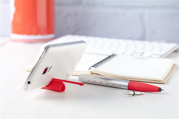 5w1 plastikowy długopis z końcówką do ekranów dotykowych, uchwytem na telefon, linijką, czyścikiem do ekranów i śrubokrętem. Z niebieskim wkładem.