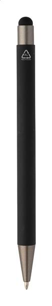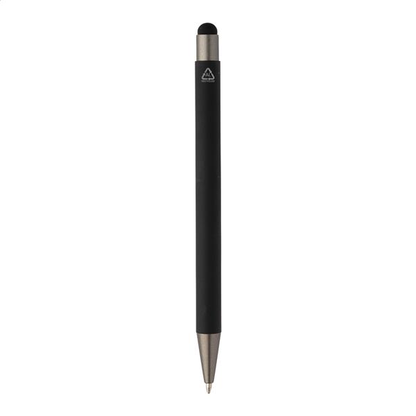 Długopis z recyklingowanego aluminium z końcówką do ekranów dotykowych z gumowanym korpusem i elementami w kolorze gunmetal. Z niebieskim wkładem.