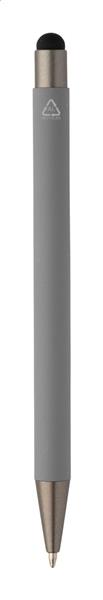 Długopis z recyklingowanego aluminium z końcówką do ekranów dotykowych z gumowanym korpusem i elementami w kolorze gunmetal. Z niebieskim wkładem.