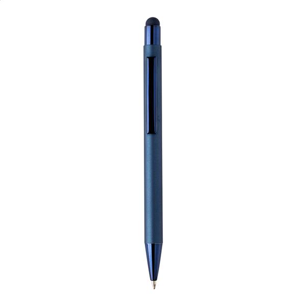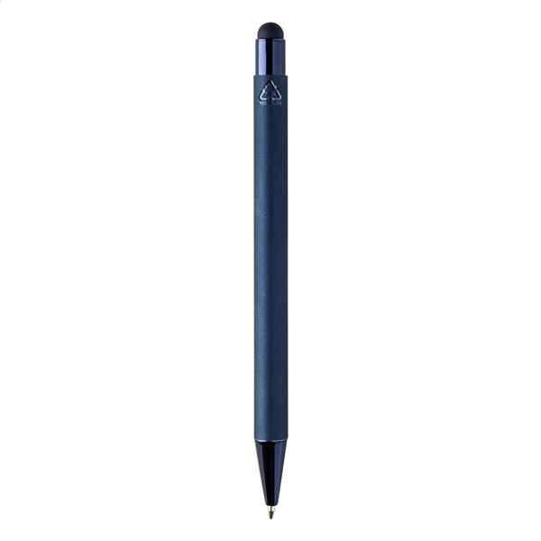Długopis z recyklingowanego aluminium z końcówką do ekranów dotykowych z gumowanym korpusem i kolorowymi błyszczącymi metalowymi elementami. Ze specjalną powłoką do grawerowania lustrzanego pasującego do metalowych części. Z niebieskim wkładem.