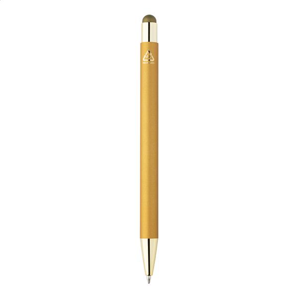 Długopis z recyklingowanego aluminium z końcówką do ekranów dotykowych z gumowanym korpusem i kolorowymi błyszczącymi metalowymi elementami. Ze specjalną powłoką do grawerowania lustrzanego pasującego do metalowych części. Z niebieskim wkładem.