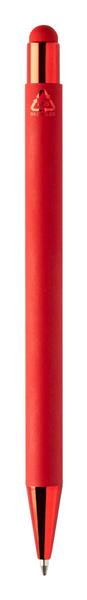 Długopis z recyklingowanego aluminium z końcówką do ekranów dotykowych z gumowanym korpusem i kolorowymi błyszczącymi metalowymi elementami. Ze specjalną powłoką do grawerowania lustrzanego pasującego do metalowych części. Z niebieskim wkładem.