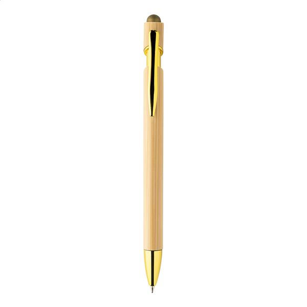 Bambusowy długopis z końcówką do ekranu dotykowego, błyszczącymi metalicznymi detalami i rysikiem w pasującym kolorze. Z niebieskim wkładem.