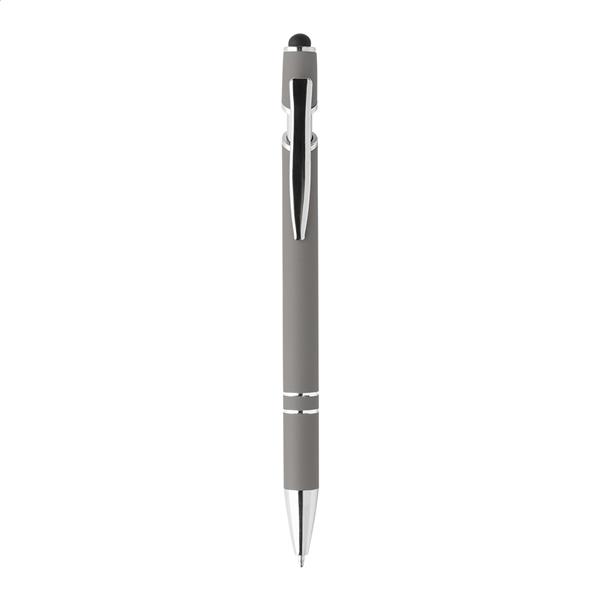 Długopis z recyklingowanego aluminium z końcówką do ekranu dotykowego, gumowaną obudową i chromowanymi detalami. Z niebieskim wkładem.