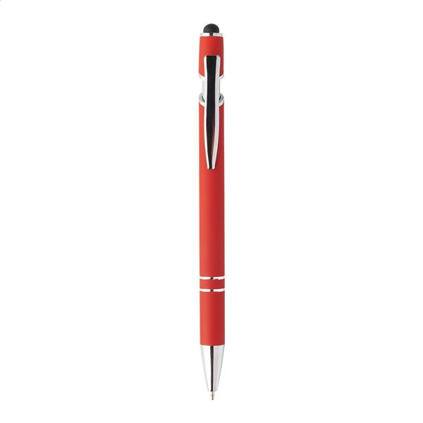 Długopis z recyklingowanego aluminium z końcówką do ekranu dotykowego, gumowaną obudową i chromowanymi detalami. Z niebieskim wkładem.