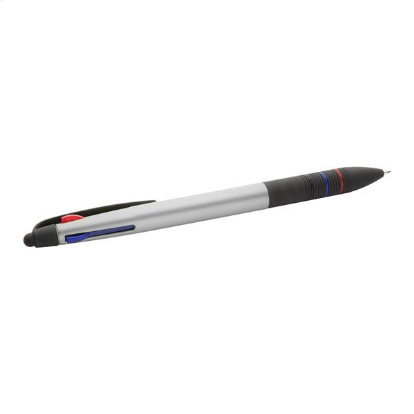 Plastikowy długopis z końcówką do ekranów dotykowych z gumowym uchwytem i metalicznym, matowym wykończeniem. Zawiera 3 wkłady: czarny, niebieski i czerwony.