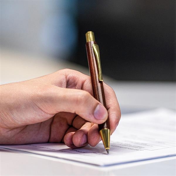Długopis z niebieskim wkładem w drewnianej obudowie, ze złotymi elementami.