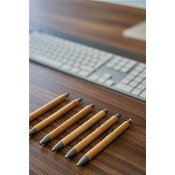 Bambusowy długopis z niebieskim wkładem, antracytowymi elementami i z gumką do obsługi ekranów dotykowych.