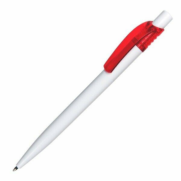 Plastikowy długopis promocyjny. Wyposażony w niebieski wkład.
