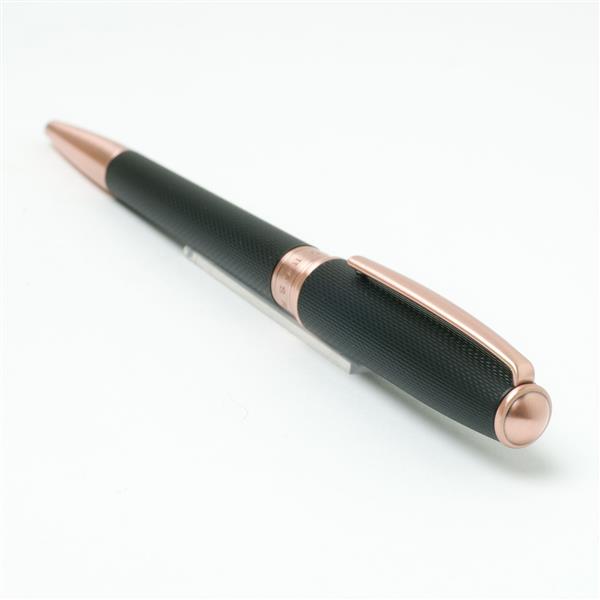 Klasyczne i dobrze wyważone pióro `Essential` wraca z nowym wyglądem, aby uzyskać zdecydowanie męski wygląd. Wysoce techniczna, matowa, diamentowa faktura cięcia jest pokryta głęboką czernią, z luksusowymi, ale swobodnymi akcentami różowego złota – nadając linii niepowtarzalny, nowoczesny wygląd.