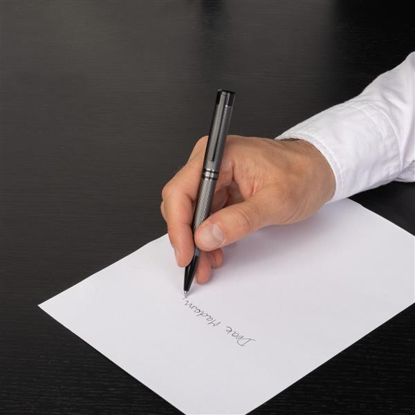 Linia Filament uwydatnia znaczenie zrozumienia potrzeby równowagi. Doskonale wyważona sylwetka oferuje luksusowe wrażenia podczas pisania. Grawerowany wzór, inspirowany architekturą przemysłową, jest unowocześniony przez matowe platerowanie, a czarne paski na środkowym pierścieniu dodają sportowego charakteru. Rozmiar: Dia. 11 / h. 140 mm Kolor: Szary