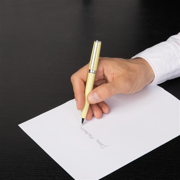 Nasza kultowa sylwetka Gear powraca z ponadczasowym zwrotem, z uproszczonym pierścieniem logo i błyszczącym lakierem. Ta nowa wersja Gear jest już kultowa i prawdopodobnie jest naszym najbardziej komercyjnym produktem, z luksusowym, błyszczącym lakierem na oprawie. Wyrafinowane podejście do minimalistycznego wzornictwa sprawia, że jest to natychmiastowy klasyczny przyrząd do pisania i jest dostępny w szerokiej gamie kolorów, takich jak ten piękny pastelowy żółty odcień.