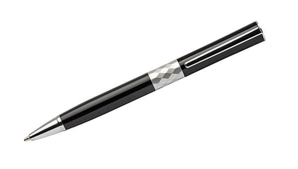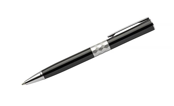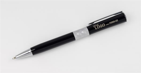 Nowoczesny długopis zaprojektowany zgodnie z najnowszymi trendami. Pośrodku metalowego korpusu znajduje się ozdobny pierścień wyglądem przypominający kryształ, dzięki czemu długopis zyskuje stylowy wygląd. Znakowanie możliwe na korpusie.
