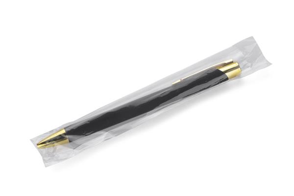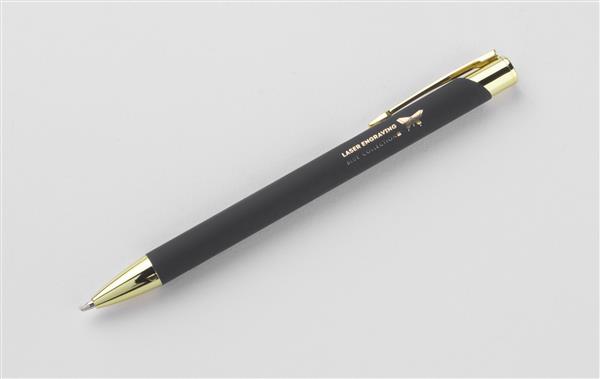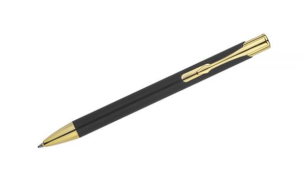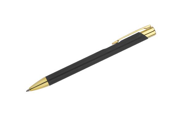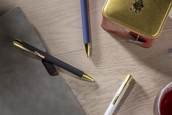 GOLDEN to długopis wyróżniający się przyjemną w dotyku gumowaną powierzchnią oraz wyjątkowo eleganckimi złotymi wykończeniami. Korpus wykonany z aluminium. Możliwość wygrawerowania logo w kolorze złotym, które doskonale pasuje do wykończeń długopisu. Długopis automatyczny. Wkład typu G2 w kolorze niebieskim.