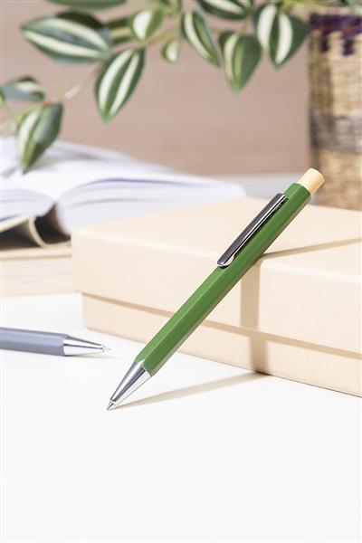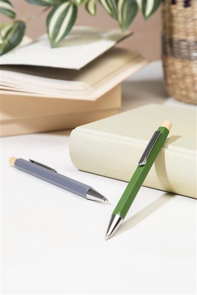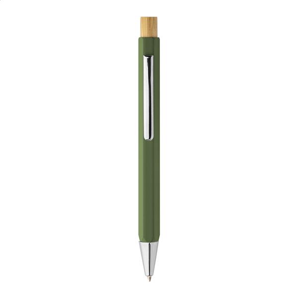 Sześciokątny długopis z recyklingowanego aluminium z bambusowym przyciskiem i chromowanymi elementami. Z niebieskim wkładem.