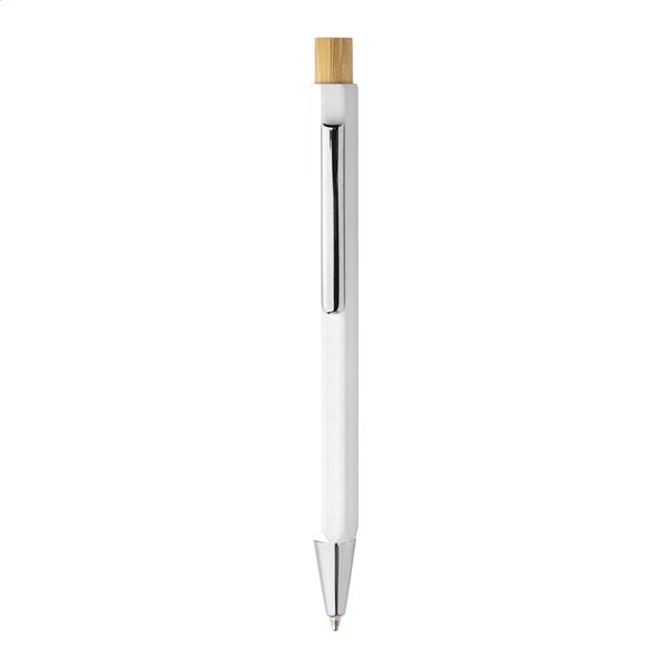 Sześciokątny długopis z recyklingowanego aluminium z bambusowym przyciskiem i chromowanymi elementami. Z niebieskim wkładem.