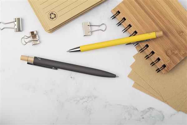 Długopis z aluminium pochodzącego z recyklingu z gumowanym wykończeniem i bambusowym włącznikiem oraz chromowanym wykończeniem. Ze specjalną powłoką pod grawer lustrzany. Niebieski wkład.