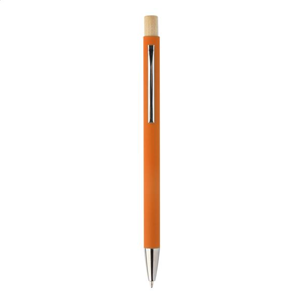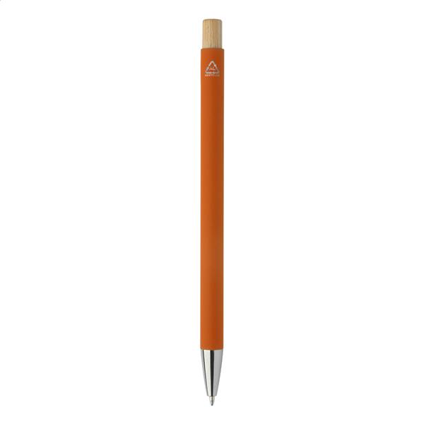Długopis z aluminium pochodzącego z recyklingu z gumowanym wykończeniem i bambusowym włącznikiem oraz chromowanym wykończeniem. Ze specjalną powłoką pod grawer lustrzany. Niebieski wkład.