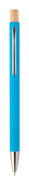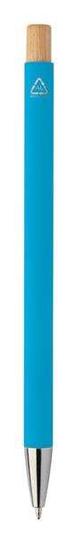 Długopis z aluminium pochodzącego z recyklingu z gumowanym wykończeniem i bambusowym włącznikiem oraz chromowanym wykończeniem. Ze specjalną powłoką pod grawer lustrzany. Niebieski wkład.