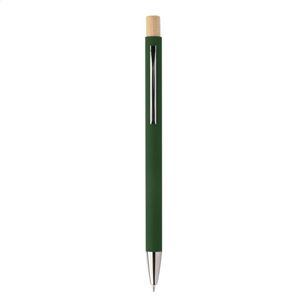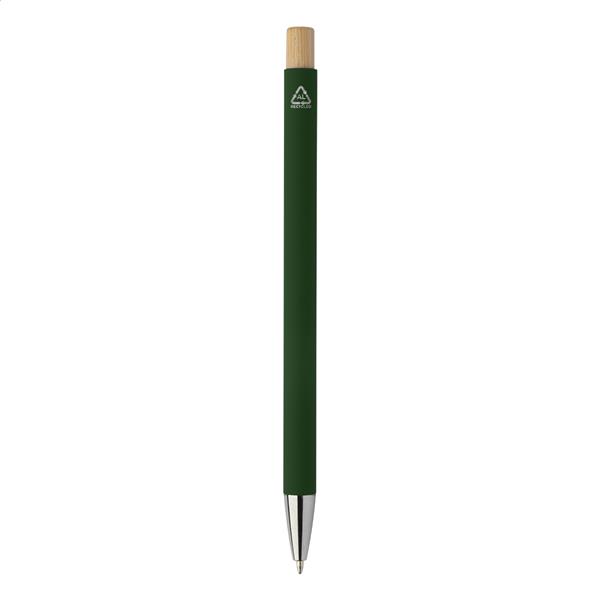 Długopis z aluminium pochodzącego z recyklingu z gumowanym wykończeniem i bambusowym włącznikiem oraz chromowanym wykończeniem. Ze specjalną powłoką pod grawer lustrzany. Niebieski wkład.