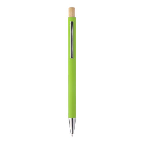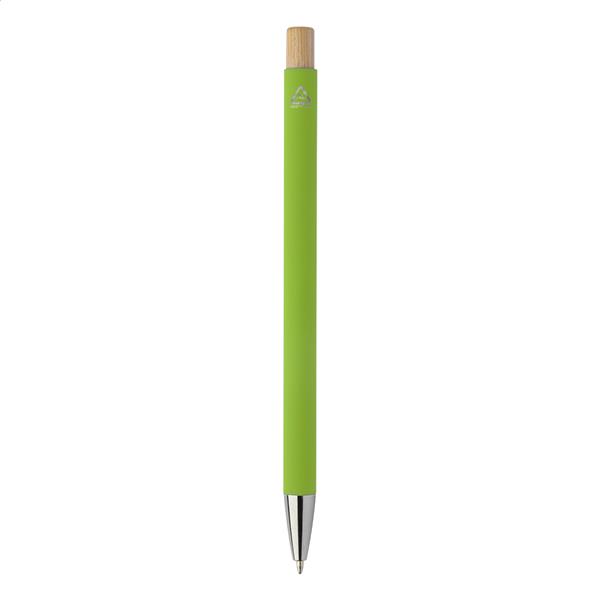 Długopis z aluminium pochodzącego z recyklingu z gumowanym wykończeniem i bambusowym włącznikiem oraz chromowanym wykończeniem. Ze specjalną powłoką pod grawer lustrzany. Niebieski wkład.