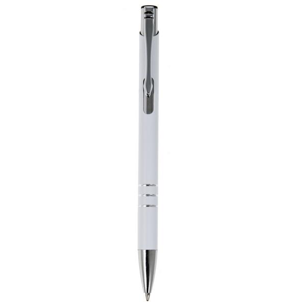 Długopis z kolorowym trzonem o błyszczącym wykończeniu, posiada elementy w srebrnym kolorze, wkład w niebieskim kolorze, produkt wykonany z aluminium