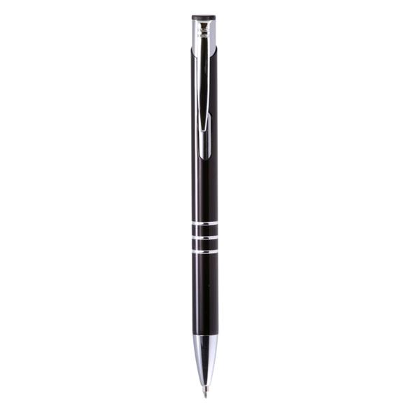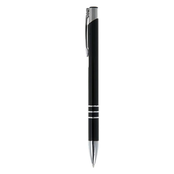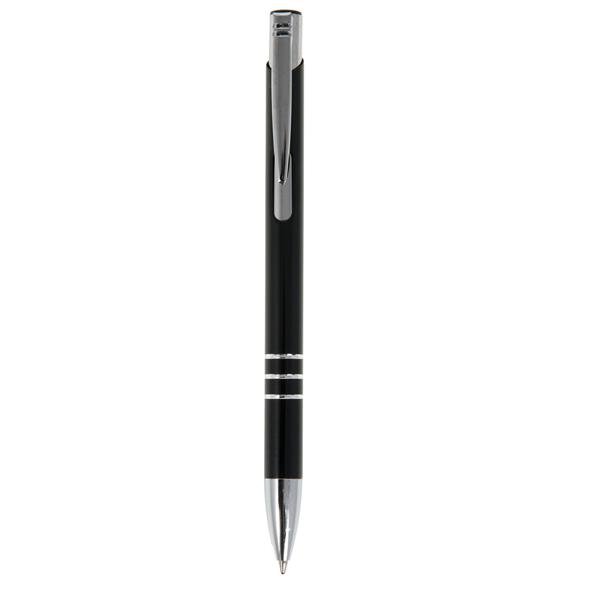Długopis z kolorowym trzonem o błyszczącym wykończeniu, posiada elementy w srebrnym kolorze, wkład w niebieskim kolorze, produkt wykonany z aluminium