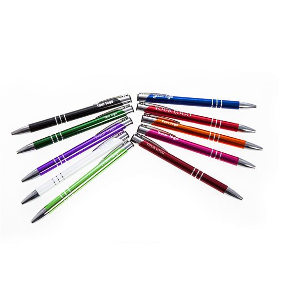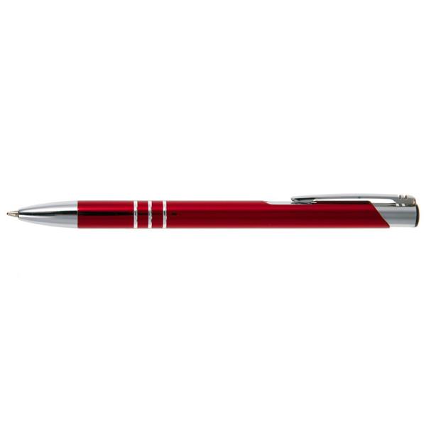 Długopis z kolorowym trzonem o błyszczącym wykończeniu, posiada elementy w srebrnym kolorze, wkład w niebieskim kolorze, produkt wykonany z aluminium