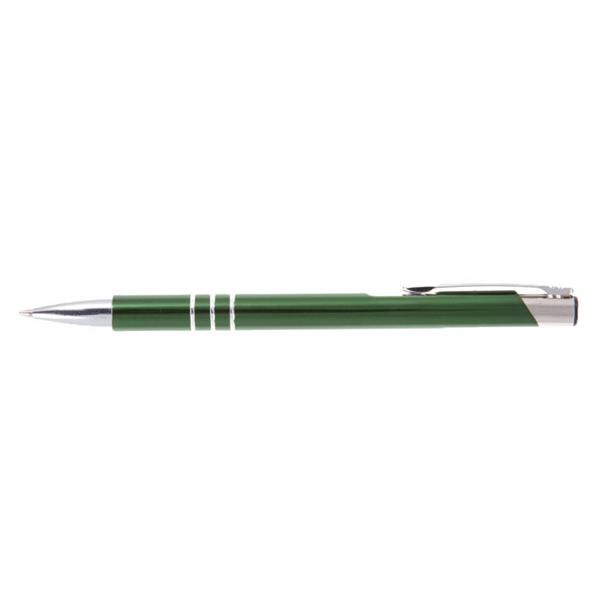 Długopis z kolorowym trzonem o błyszczącym wykończeniu, posiada elementy w srebrnym kolorze, wkład w niebieskim kolorze, produkt wykonany z aluminium