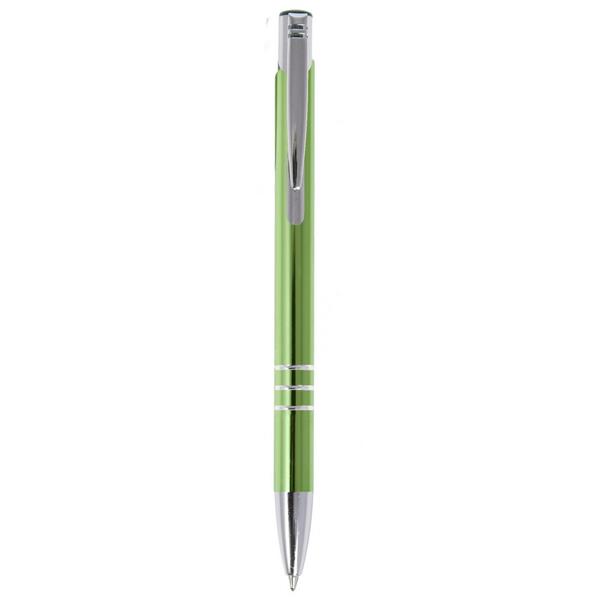 Długopis z kolorowym trzonem o błyszczącym wykończeniu, posiada elementy w srebrnym kolorze, wkład w niebieskim kolorze, produkt wykonany z aluminium